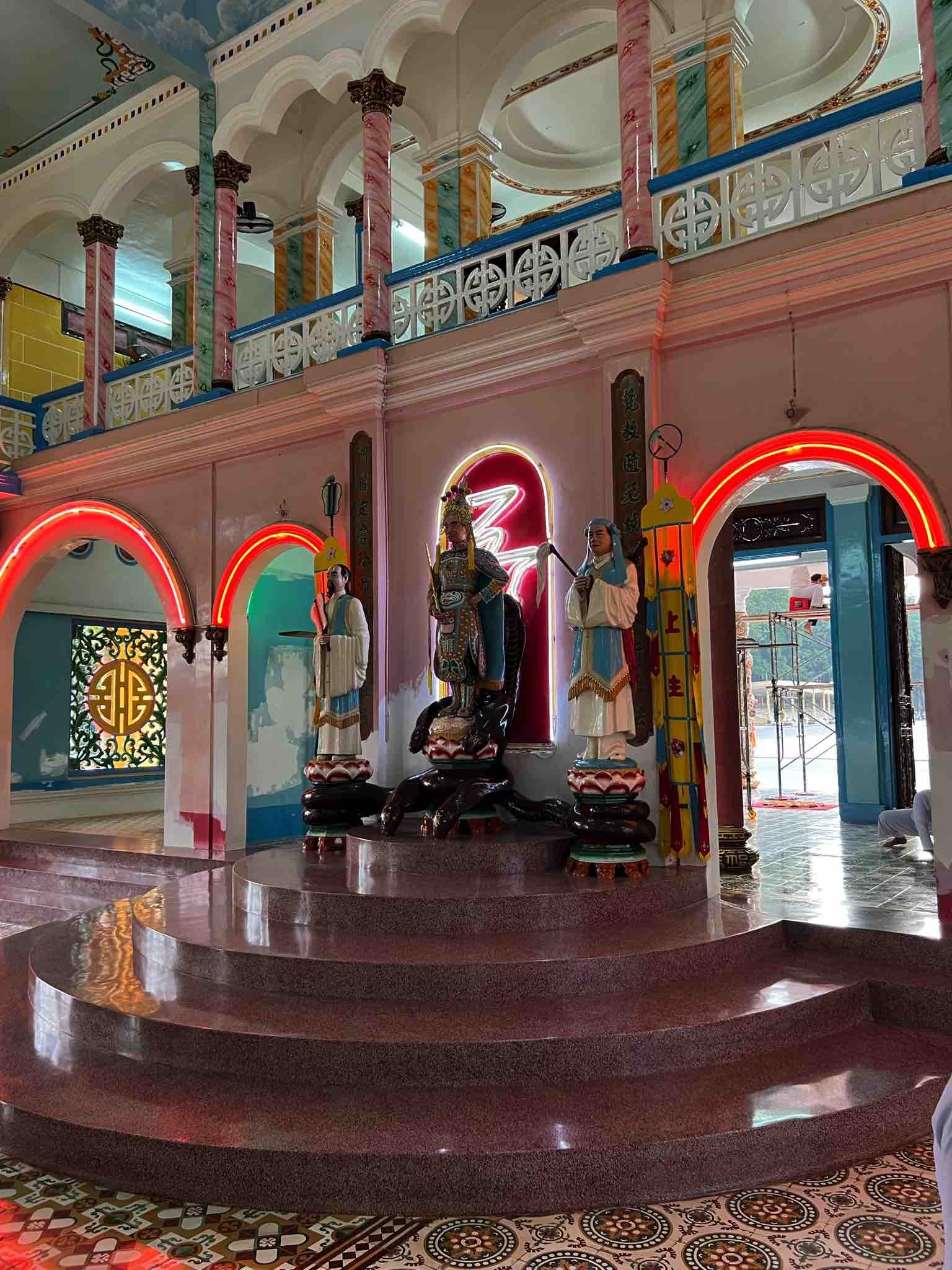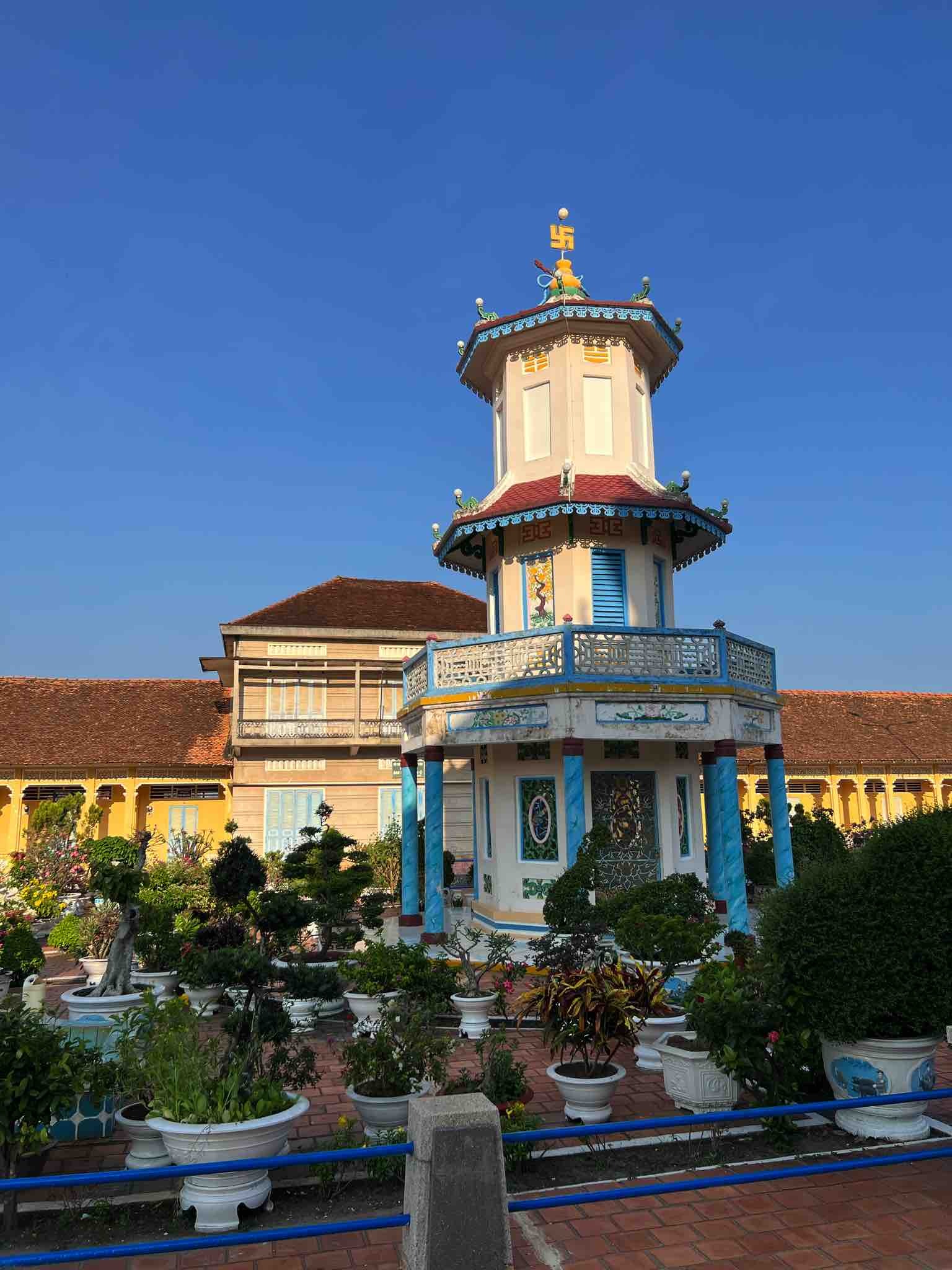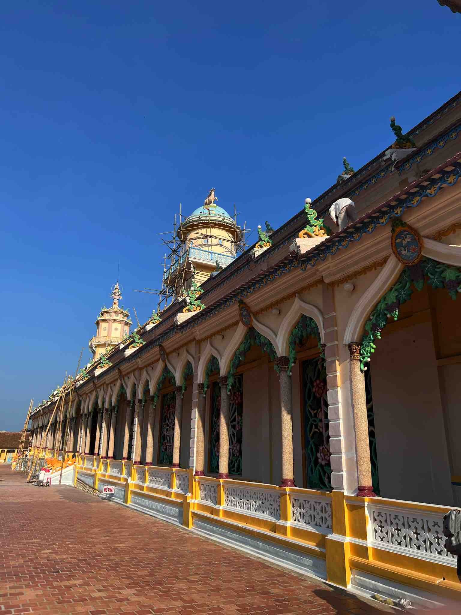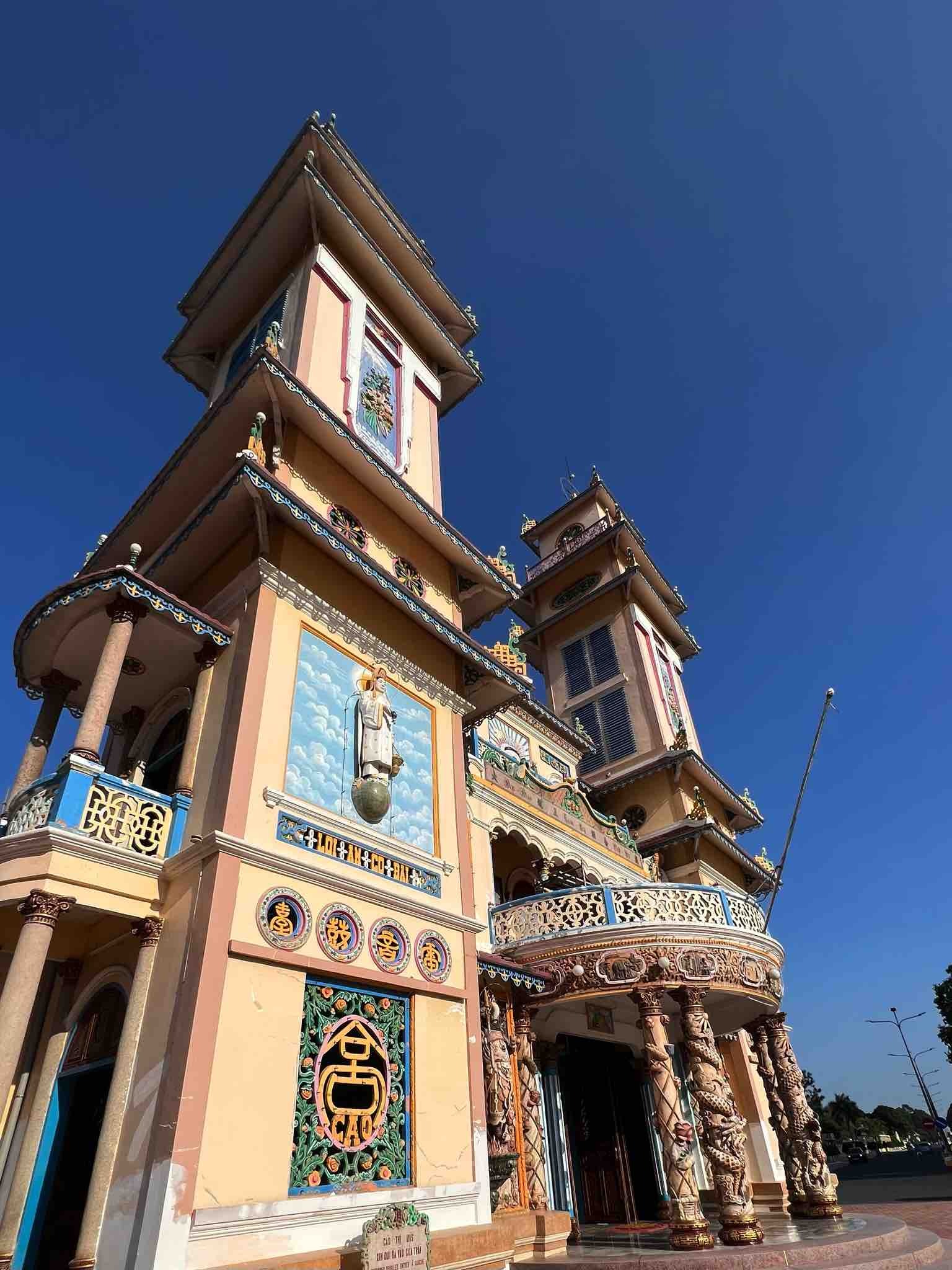 Caodaist temples are distinguished by their unique architectural style, which combines elements of Buddhist pagodas, Christian cathedrals, and Taoist temples. The most characteristic feature of the temples is their colorful facade, decorated with rich ornamentation and symbols referring to different religious traditions.