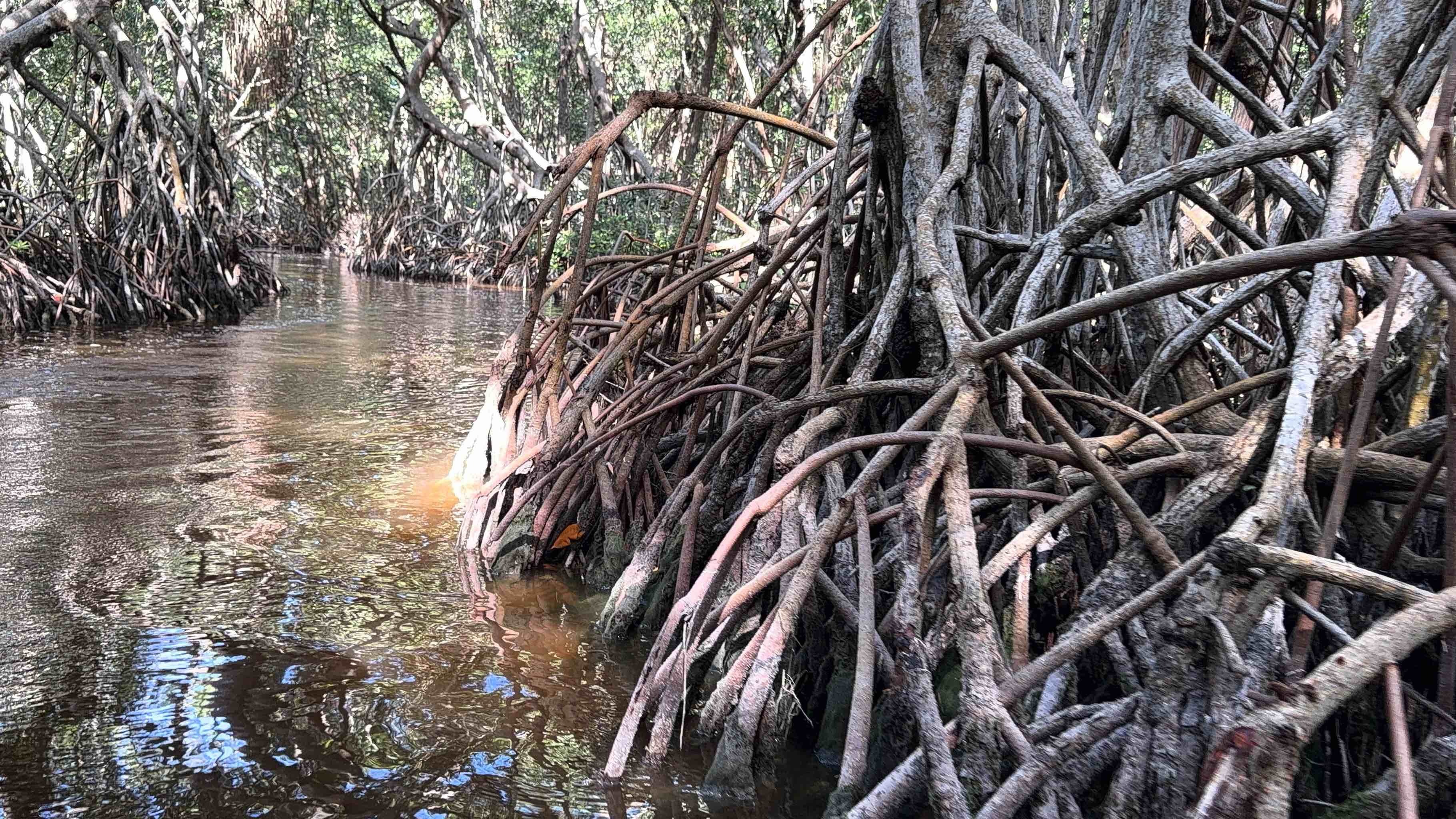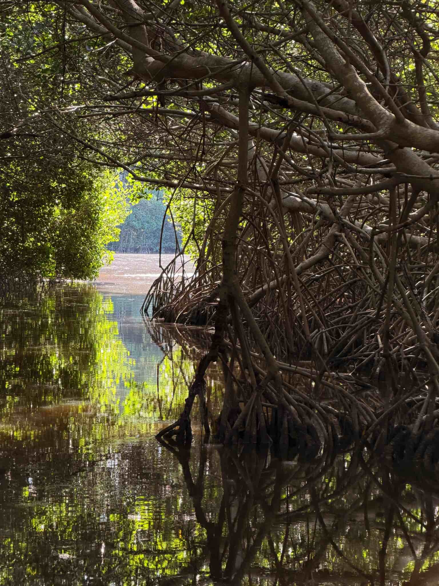 Z każdej strony otaczały nas mangrowce – drzewa o splątanych korzeniach, które wyglądają jakby chodziły po wodzie. Ich gałęzie tworzyły nad nami zielony tunel.